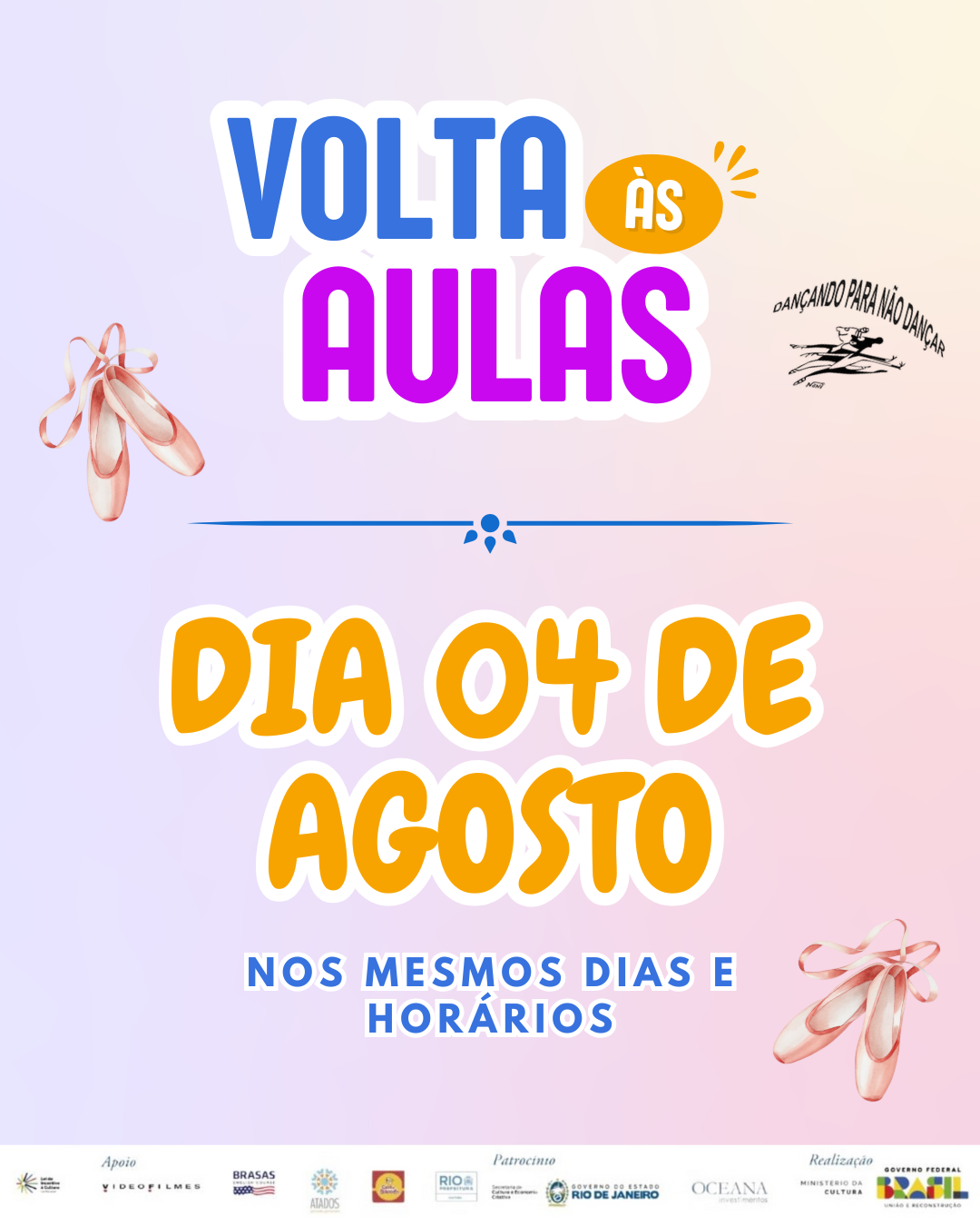 Estamos de volta a partir do dia 4 de agosto, nos mesmos dias e horários! Prepare sua sapatilha e venha dançar com a gente! 🩰✨