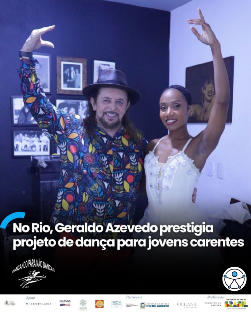 📌 Parceiro do Teatro Rival Petrobras há décadas, o cantor e compositor pernambucano Geraldo Azevedo voltou ao tradicional palco da Cinelândia, no Rio de Janeiro, para prestigiar o projeto idealizado pela esposa, a bailarina Thereza Aguilar. O “Dançando Para Não Dançar” oferece acesso de crianças e jovens de comunidades populares ao balé clássico, fortalecendo inclusão social por meio da arte.